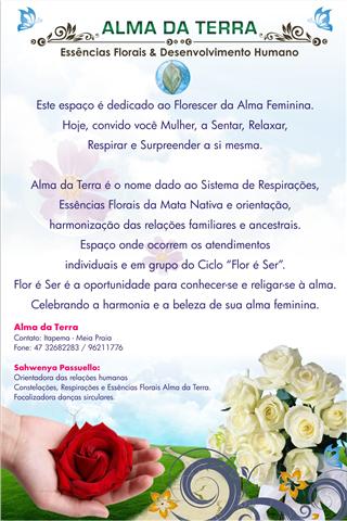 Desde já fica aqui o agradecimento da Alma da Terra, pelo maravilhoso evento e também a sugestão para que as organizadoras abram um espaço destinado a Cursos, Pequenos Workshops e Palestras destinados a Mulher, com o tema: Saúde, Bem Estar e Autoconhecimento.
